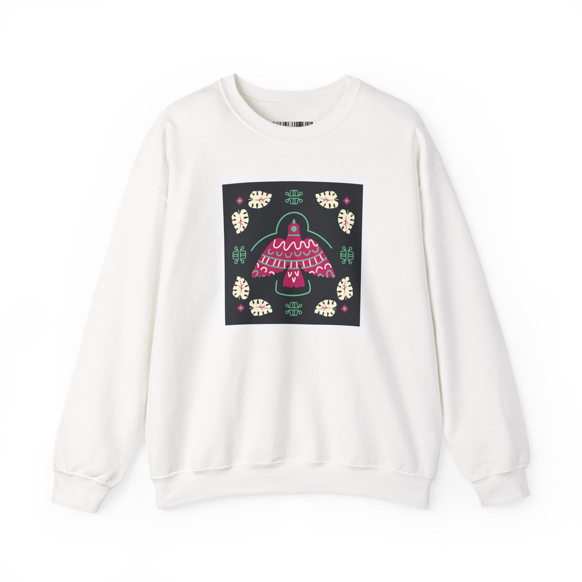 Soft, roomy, and quietly festive — this crewneck brings a handcrafted, folk-art spirit to everyday wear. The medium-weight cotton-poly blend feels substantial without being stiff, and the classic cut lets the embroidered-style graphic sit like a little patchwork scene on your chest. Imagine slipping this on for an evening walk under string lights, or layering it for a cozy night of baking and board games. The color-blocked square artwork reads like a stitched ornament: warm pinks and forest greens pop against the clean sweatshirt ground, lending a homey, celebratory mood without shouting. It’s built to hold up — doubled stitching at stress points and an elastic rib collar keep the shape wash after wash — so the sentimental design stays part of your rotation season after season.